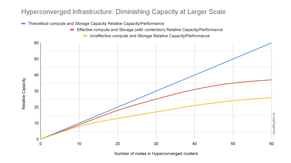 However, hyperconverged setups start to show limitations as environments grow. Compute and storage begin competing for the same resources, making performance harder to predict under load. Scaling compute automatically scales storage, even when additional capacity or IOPS are not required. In practice, once clusters reach roughly 20 to 30 nodes or begin running storage-intensive workloads, HCI infrastructure might become harder to operate and less efficient with either storage or compute being underutilized. Careful capacity planning should be constantly conducted when deploying larger HCI clusters.