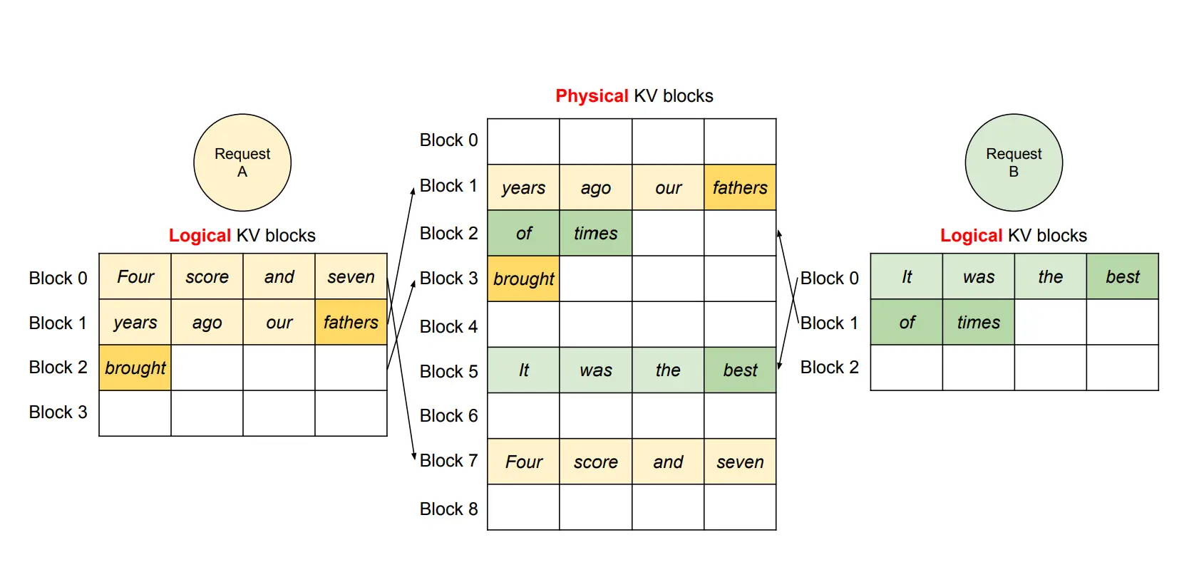 As shown in the image above, the PagedAttention kernel addresses fragmentation by storing KV blocks non-contiguously. During attention computation, the query vector (“forth”) multiplies with key vectors from each block (e.g., Block 0: “Four score and seven”) to compute attention scores, then multiplies those scores with value vectors to produce the final output. This allows KV blocks to reside in non‑contiguous physical memory, enabling more flexible paged memory management.